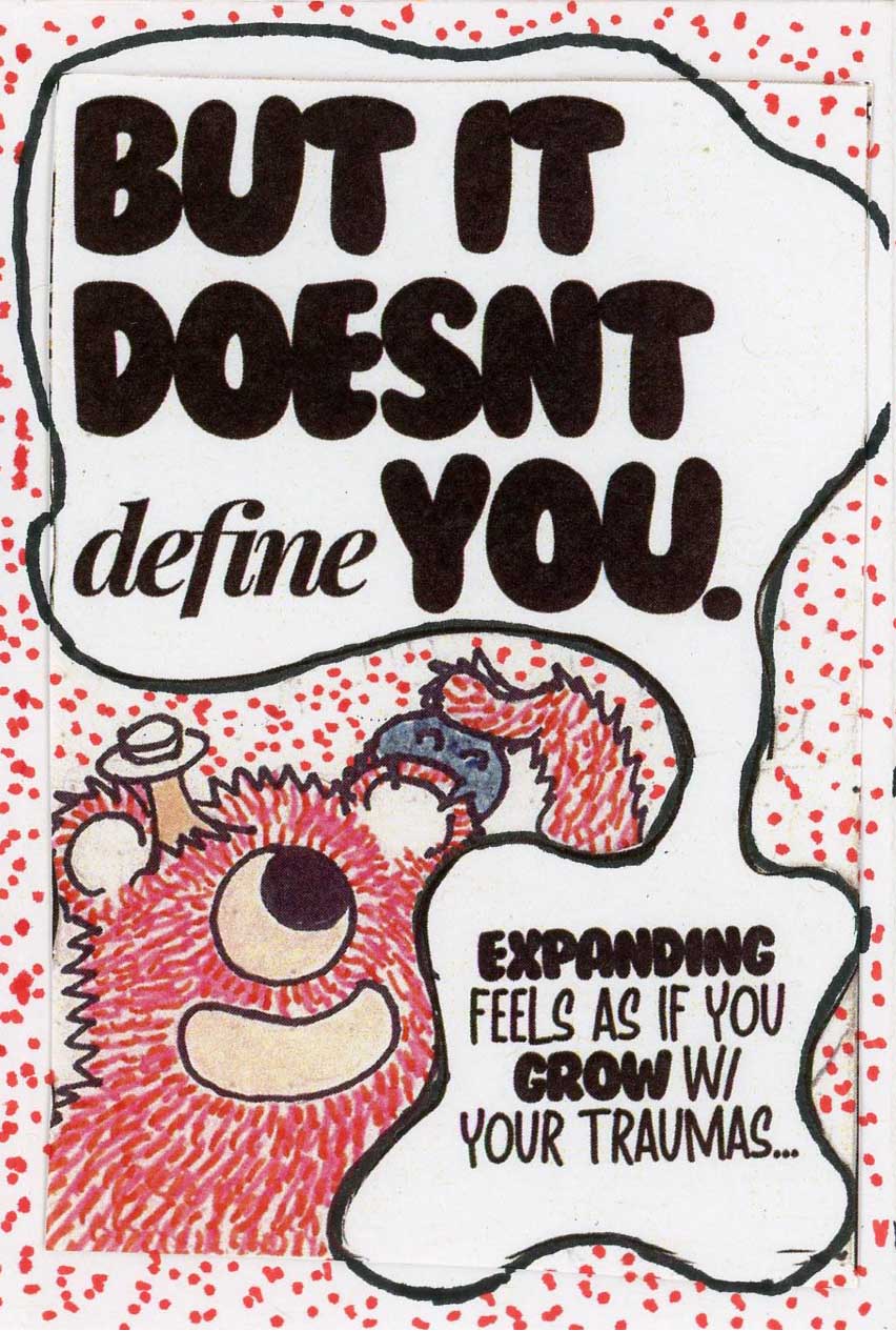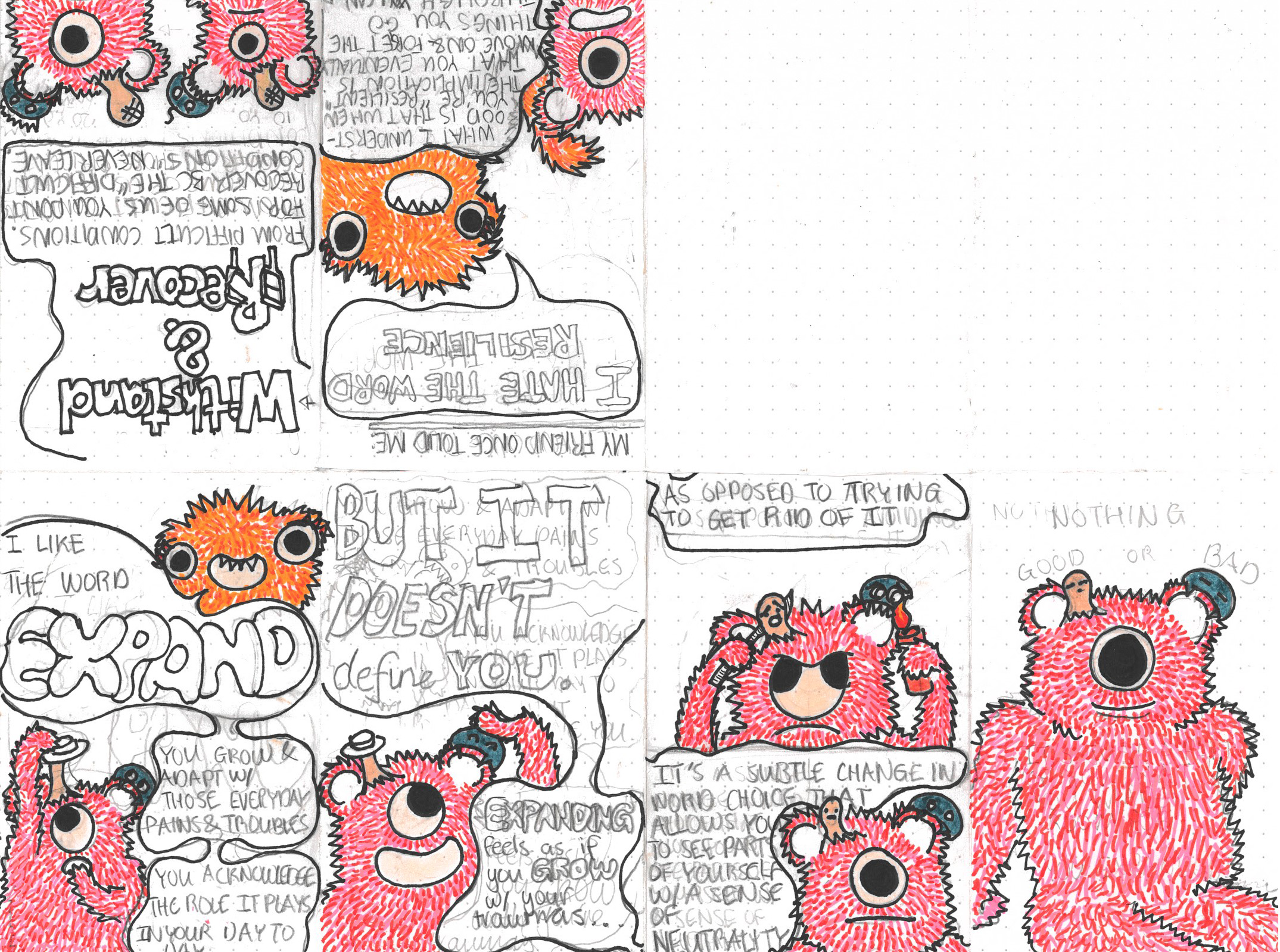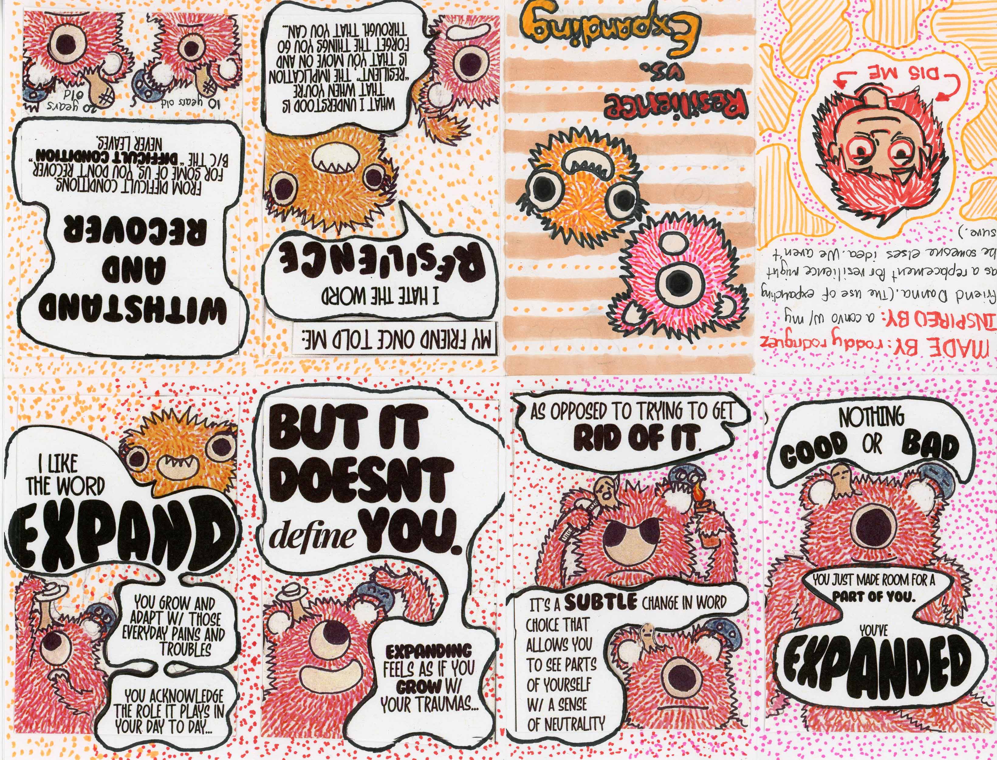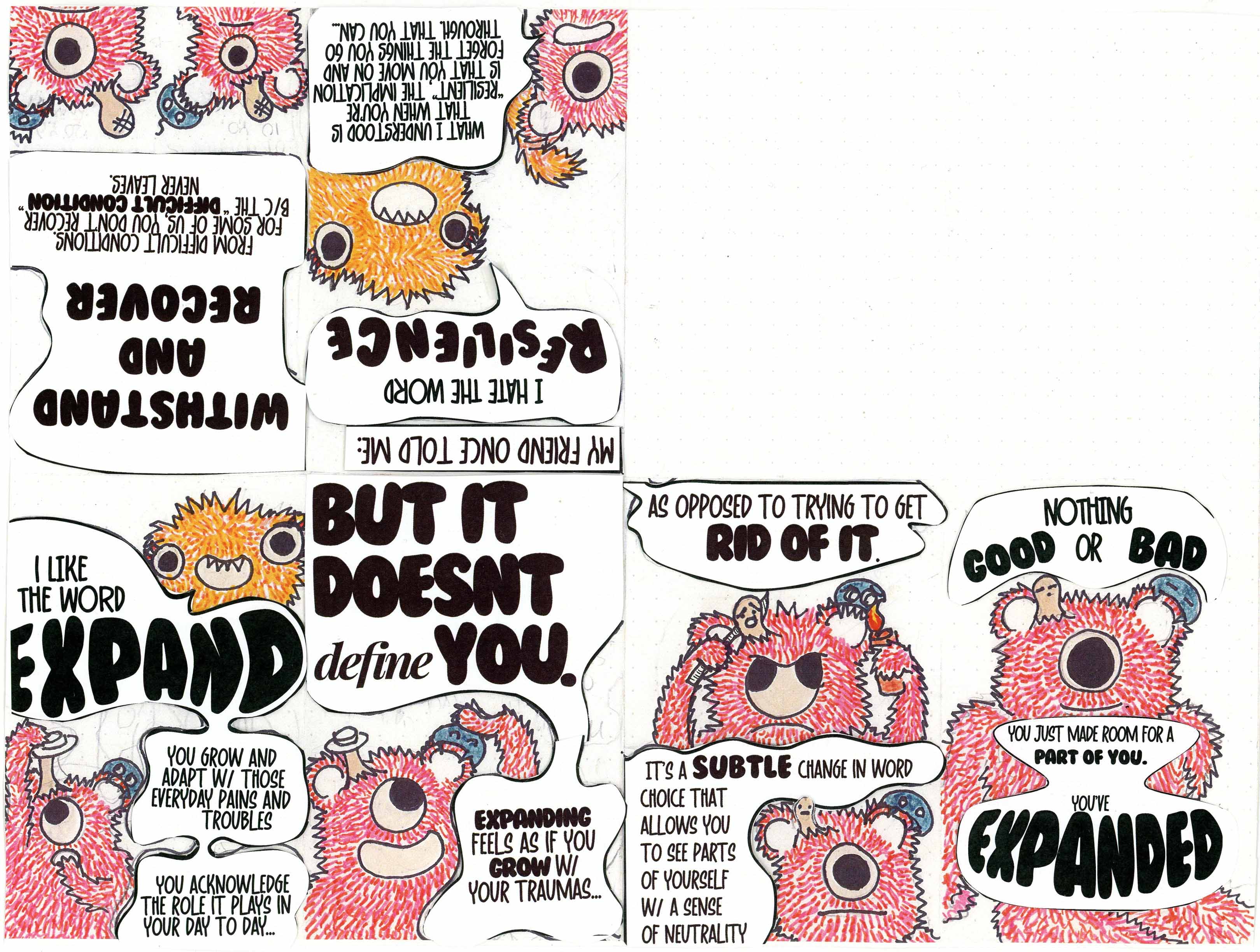 I finally chose the topic about growth because I figured readers would be able to relate to the zine's interpretation of growth. In previous tries, I went for realism which made the zine seem a bit corny. At least for me. I opted for using these Bigfoot esque creatures because the story comes off more endearing. Or at least I hope.