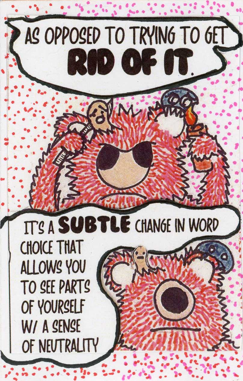 The zine turned out beautifully! The font, colors, and style got better and better the more I got to the photocopying stage of the zine process. Although I was tempted to write and color the text myself, the crude mix of glued on printed vector graphics and messy pen and ink is clearly better.